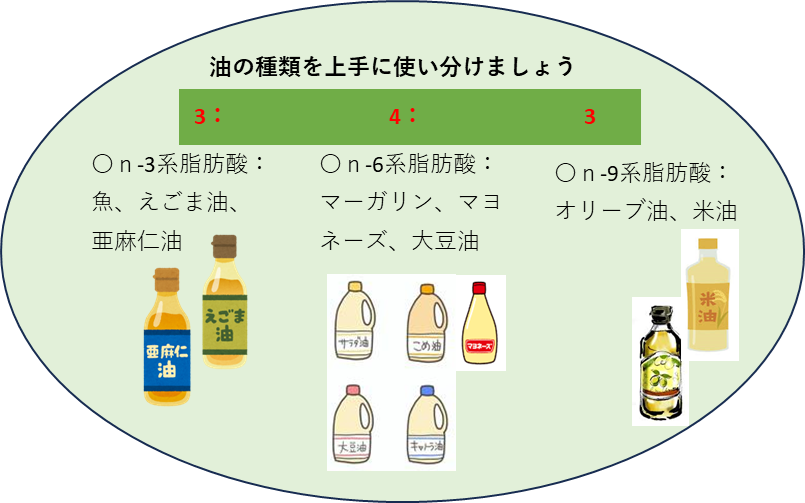 脂肪分にも種類があります。3:4:3で取り入れ、バランス良く摂取しましょう。