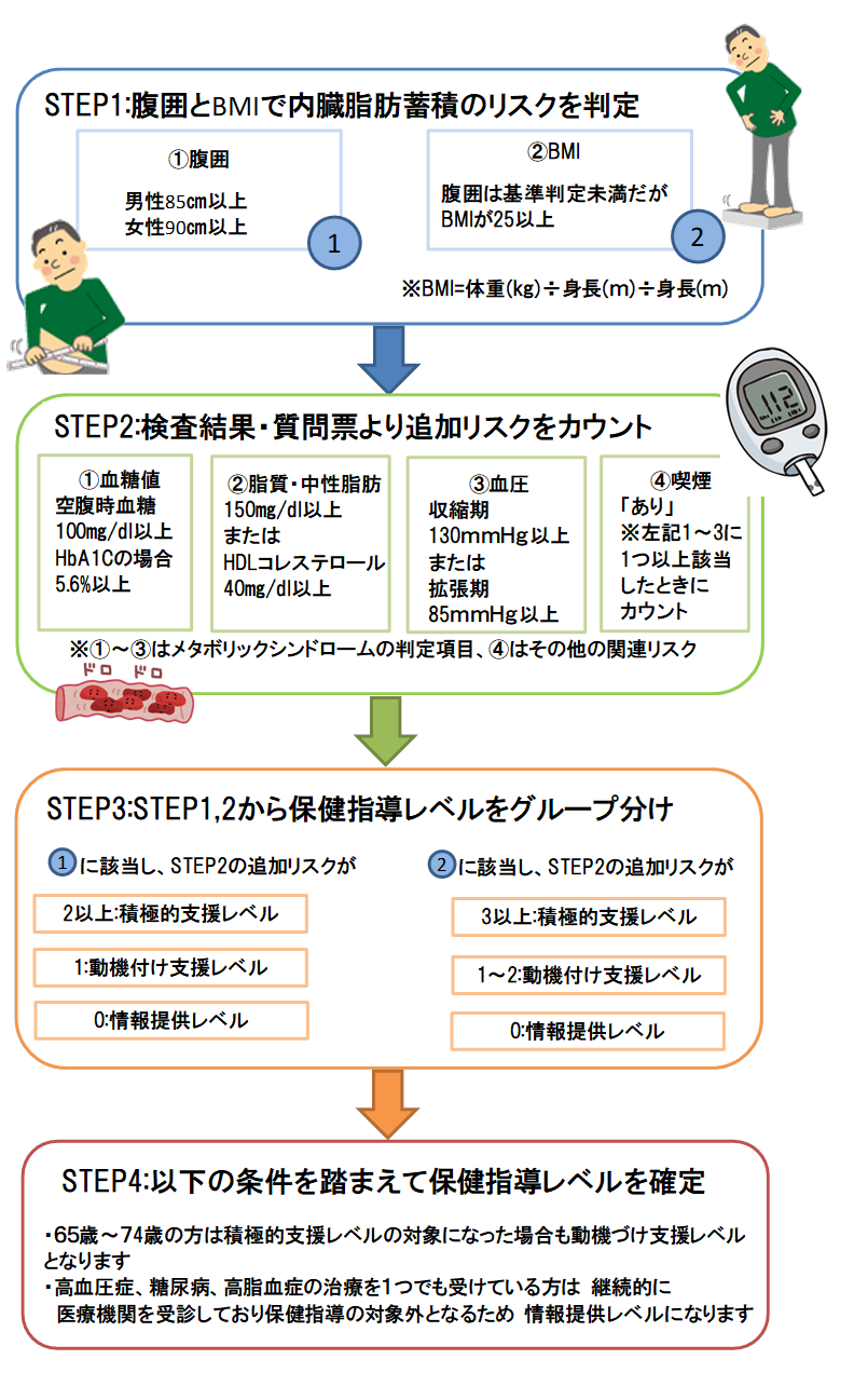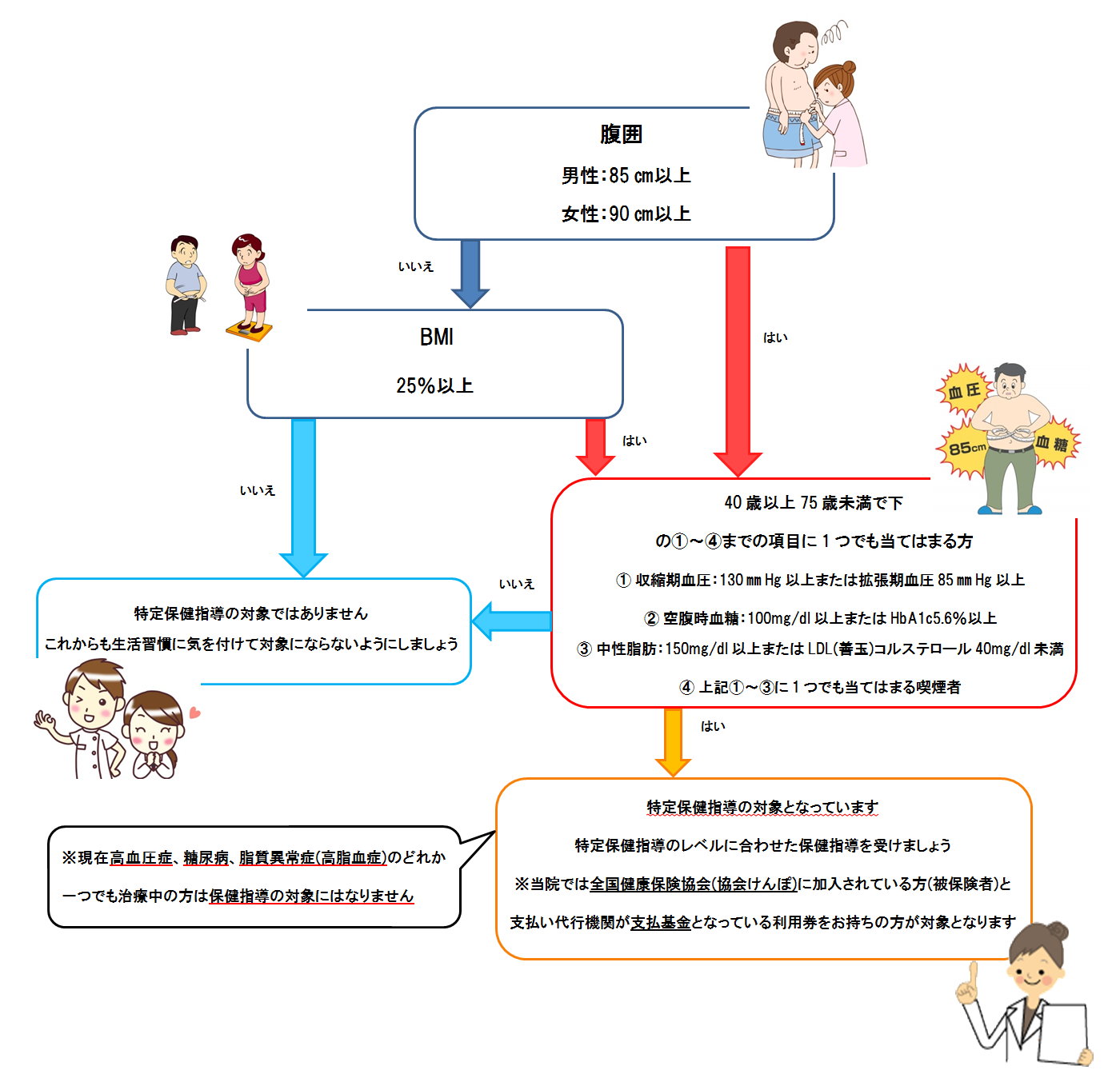 特定保健指導の方が厳しい判定基準になっていますが、軽い異常でも複数が重なると動脈硬化が進行してしまうので早期から生活習慣の改善に取り組んでいただくためです。
