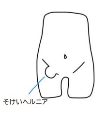 「そけい(鼠径)」とは左右の脚(あし)の付け根部分のことで、「ヘルニア」とは体の組織が正しい位置からはみ出した状態を言います。「そけいヘルニア(鼠径ヘルニア)」とは本来は腹部にある腹膜や腸の一部が、鼠径(そけい)部の筋膜が弱くなり筋肉の隙間から皮膚の下に出てくる病気です。腸が出てくることが比較的多いことから脱腸と言われたりもします。