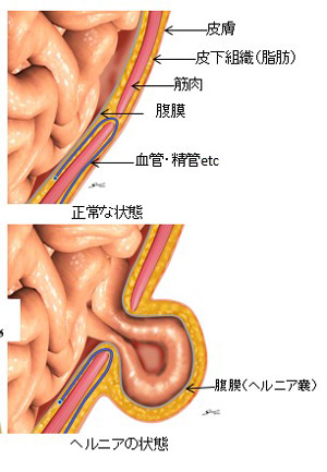 そけいヘルニア(鼠径ヘルニア、脱腸)は乳幼児から中高年者まで幅広く起こる病気です。その原因は乳幼児の場合は、先天的な要因がほとんどですが、中高年者の場合は加齢によって内蔵や組織を支えている腹膜や筋膜、筋肉が衰えることにあります。