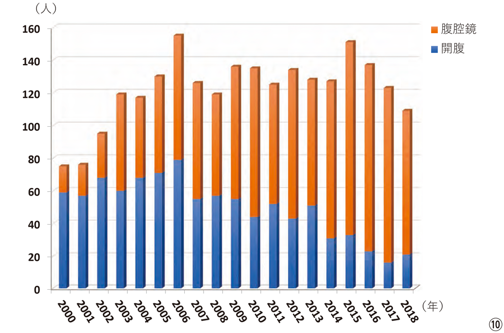 2000年より大腸がんに対する腹腔鏡手術を開始しました⑨。当初の適応としては、原則としてstage0~1の比較的進行度の低い早期がんの患者さんを対象としてきましたが、近年、手術機器の進歩や手術手技の向上、また、2002年に進行がんにも保険適応になり当院でも適応を徐々に拡大してきました。