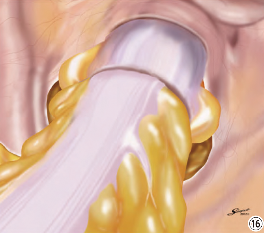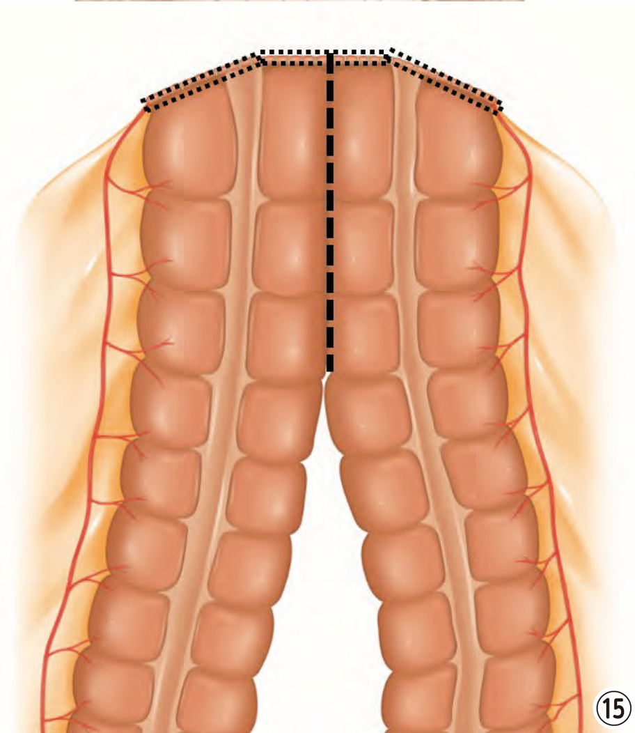 がんは周りに染み込んでいったり、周囲のリンパ節に転移したりすることがあるため、その部分だけを切除するのでは不十分です。癌の部位によって、切除するべき範囲・組織が大きく変わってしまうため、病気の診断によって、手術方法がかわります。例えば、腫瘍が上行結腸にある場合は、⑬のように、切除すべき範囲が決まります。直腸にあれば、⑭のように切除計画を立てます。これをすべて腹腔鏡で行います。切除した腸は、臍の傷を少し大きくして、そこから取り出します。切除した後は、便の通り道を確保するために、腸と腸をつなげてあげる必要があります。それを再建と言います。通常は切除した腸同士をつなぎます。再建は、臍の傷を少し大きくした部分から行ったり、お腹の中で行ったりします⑮⑯。