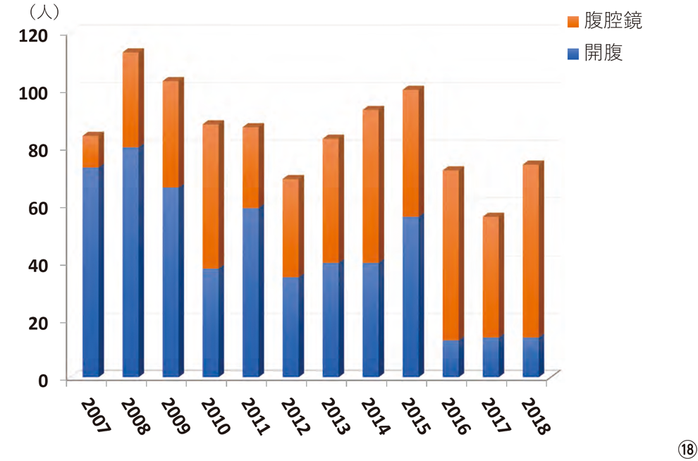 この術式に対する現在の当院での適応はすべての胃がんの患者さんに行えるわけではなく、stageIA、IBなどの比較的早期の胃がんの患者さんに主に行っています。これまで当院で行った腹腔鏡下胃切除は約500例であり、内視鏡外科学会の技術認定医4名がすべての腹腔鏡下の胃がん手術に携わっています⑱。