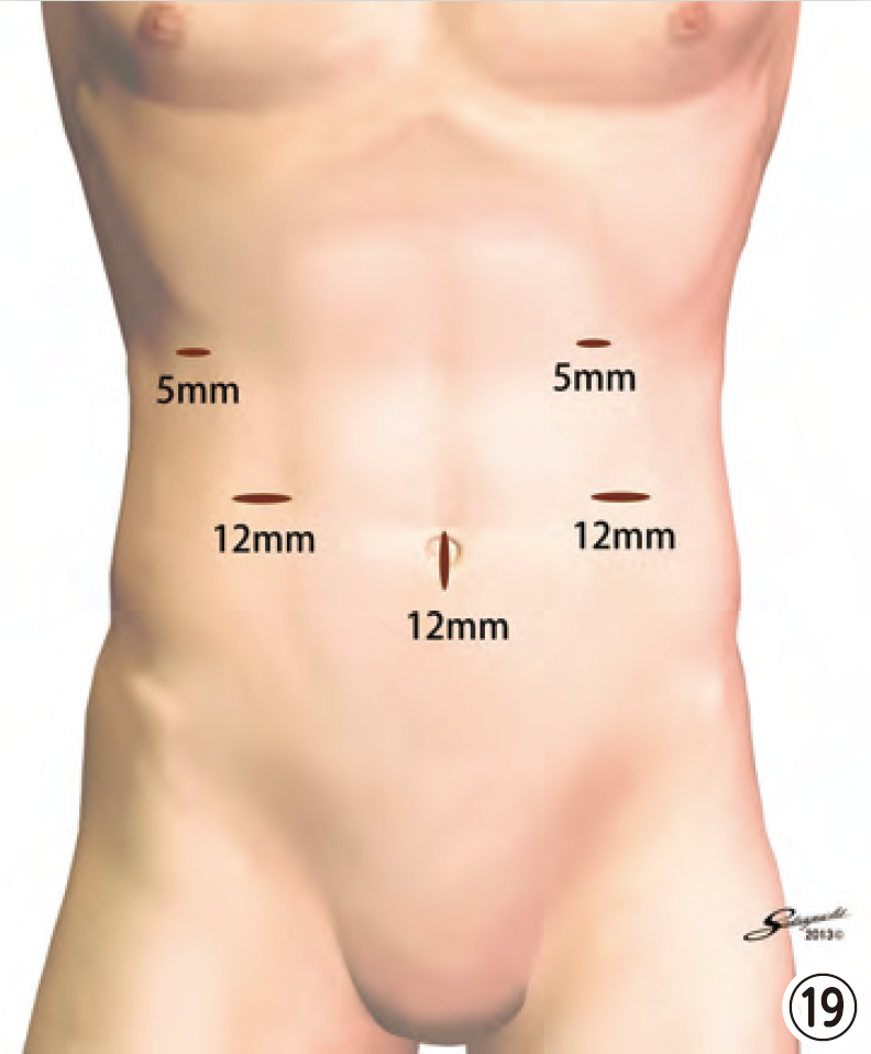 通常の腹腔鏡下胃手術はお腹に5~6か所の穴をあけて行います
