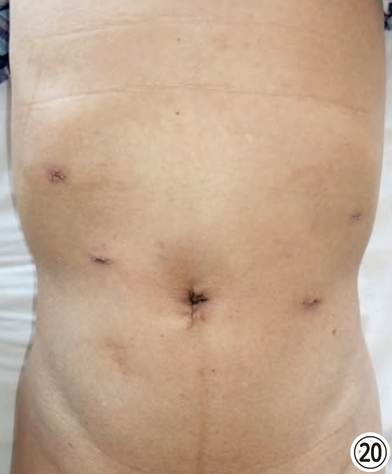 2008年から藤田保健衛生大学(現 藤田医科大学)医学部 上部消化管外科教授の宇山先生(専用ページ参照)が定期的に来院されるようになり、胃やリンパ節の切除から吻合まですべてお腹の中で行うようになりました。そしてお腹の中で切除された胃やリンパ節はお腹の中で袋にいれて臍(へそ)の3cm位の傷からお腹の外に引き出しています。この術式を完全腹腔鏡下胃切除術(LDG)と言いますが、従来の腹腔鏡補助下胃切除術(LADG)に比べて傷がさらに小さくなることによりさらに整容性が改善され、また痛みなど体への負担(侵襲)が軽減され患者さんのより早い回復が可能となりました⑰⑲⑳㉑。