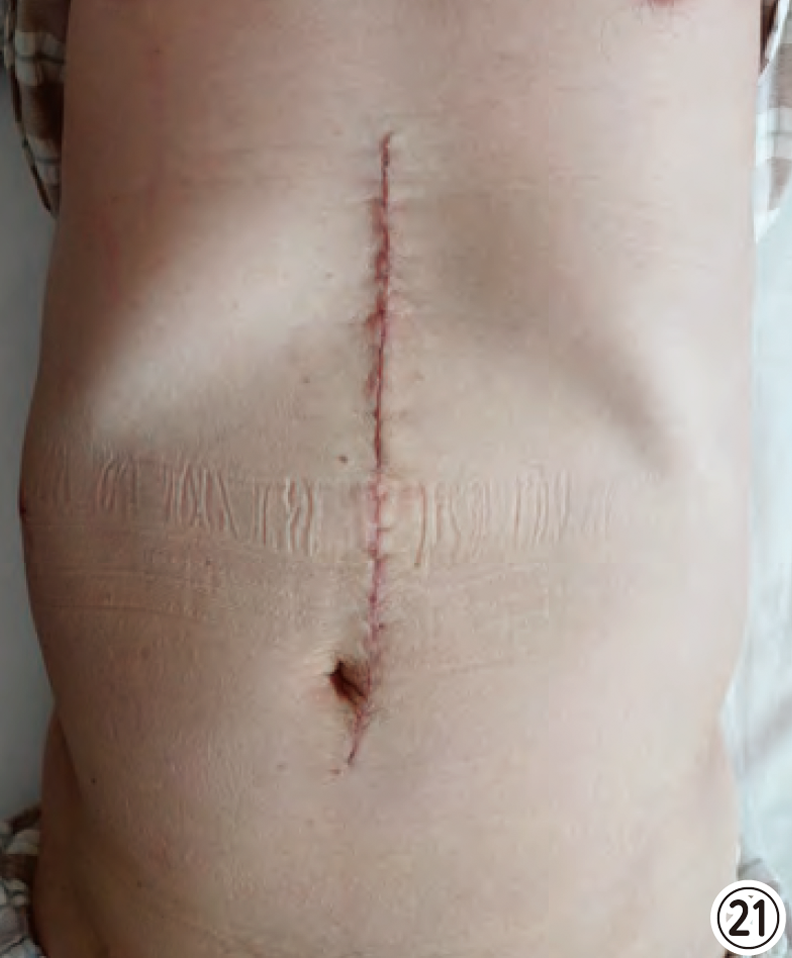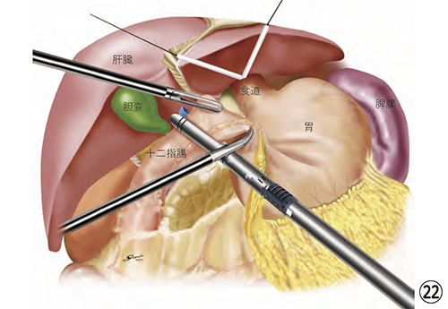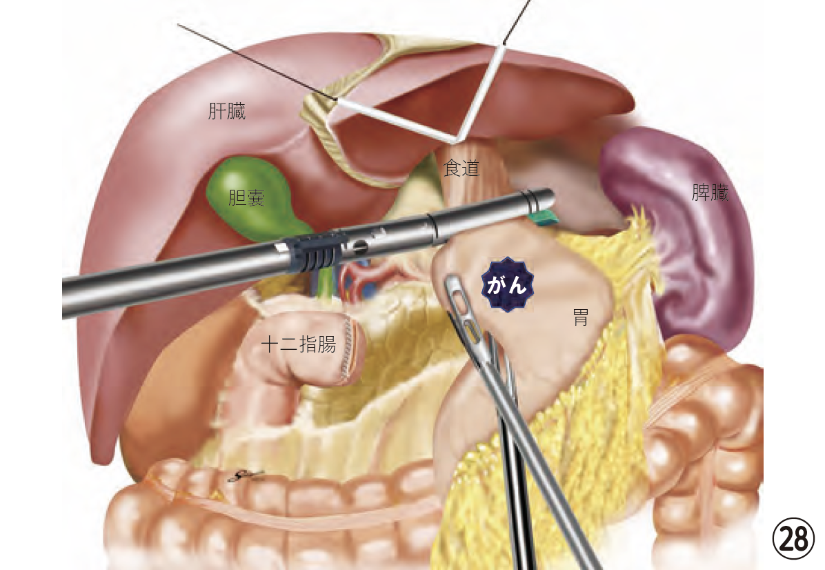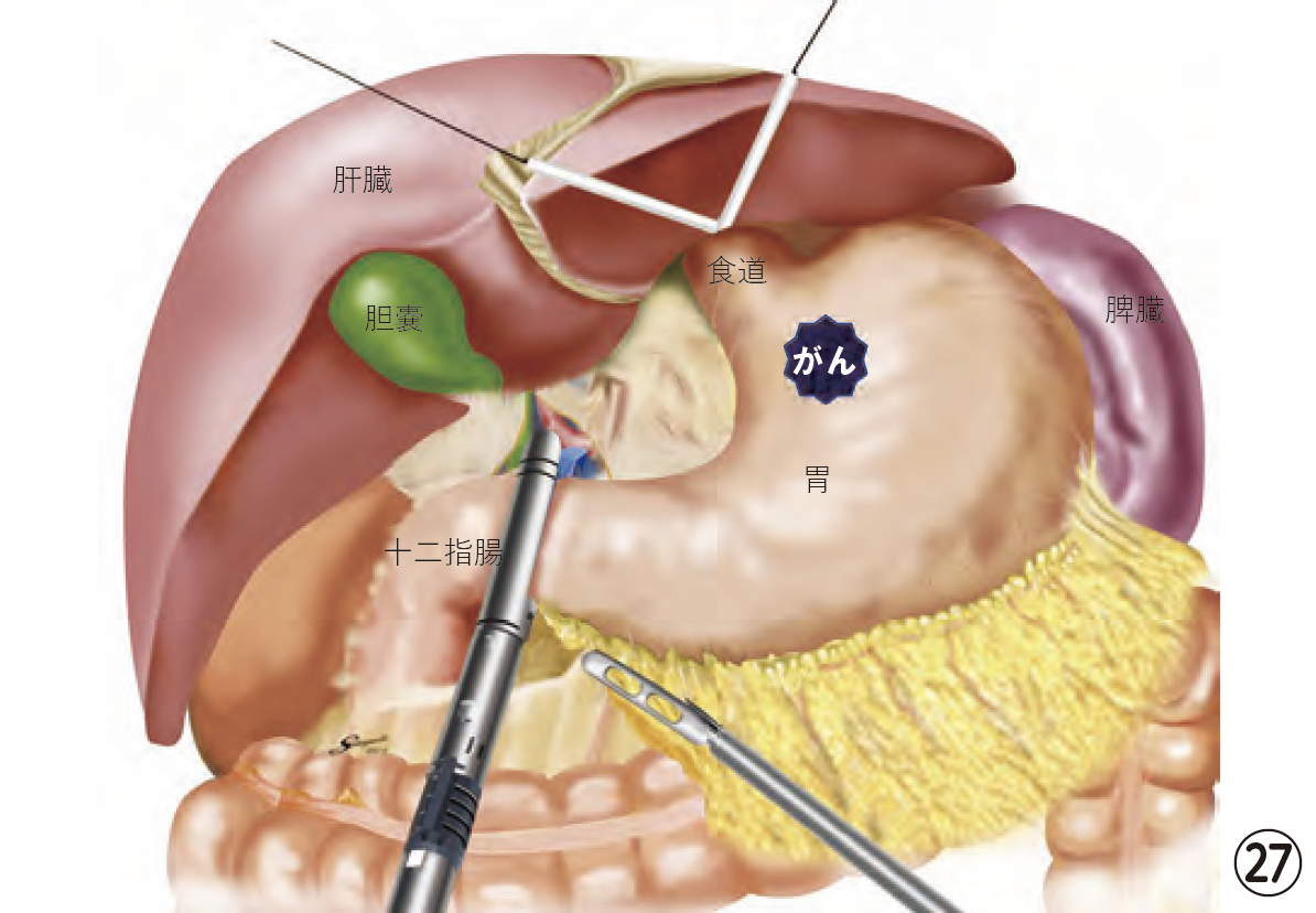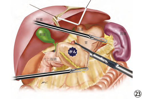 胃がんの手術は基本的に2種類の手術があります(状況によってはさらに別の方法を選択する場合もあります)。一つは目は幽門側胃切除術(胃の3分の2切除)、二つ目は胃全摘術です。幽門側胃切除というのは胃の3分の2を切除する手術です。胃の周囲のリンパ節と一緒に出口に近い方の3分の2の胃と十二指腸を一部切除する方法です㉒㉓。手術は切除だけでは終わりません。切除した後に食べ物の通り道を確保しなくてはなりません。切った胃と腸をつなげてあげる必要があります。それを再建と言います。幽門側胃切除の場合は再建の方法が3パターン(ビルロートⅠ法㉔、ビルロートⅡ法㉕、ルーワイ法㉖)あります。今ではどの方法でも腹腔鏡で行っています。胃全摘術の場合は、胃の周囲のリンパ節と、胃を全部、さらに食道の一部、十二指腸の一部を併せて切除します㉗㉘。この場合の再建方法は、ルーワイ法という方法で行われ、食道と小腸、小腸と小腸をつなげるようにします㉙。これもすべて腹腔鏡で行うことができます。